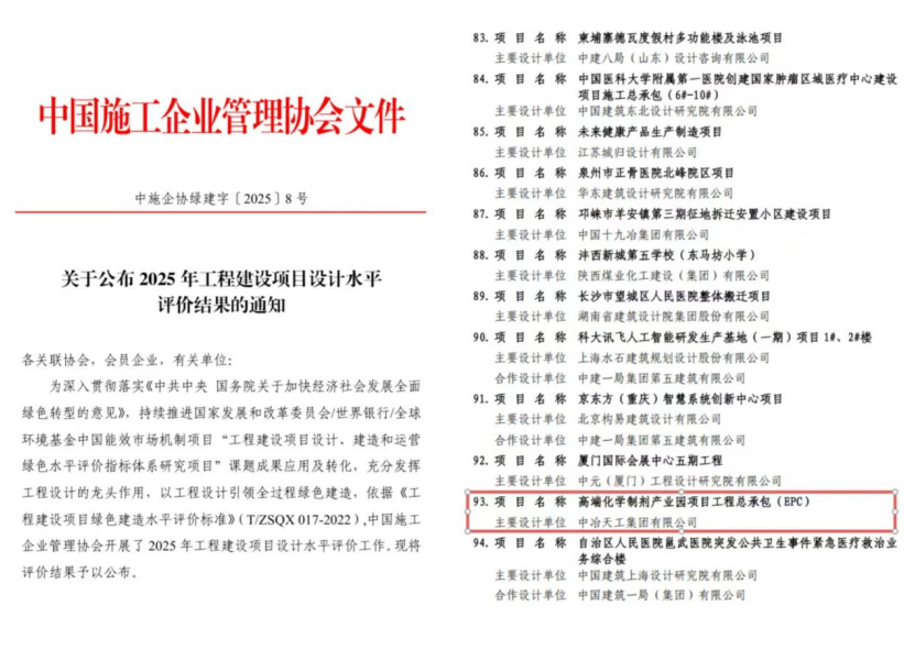 近日,中國施工企業管理協會公布了2025年工程建設項目設計水平評價結果,中冶天工承建的高端化學制劑產業園項目憑借卓越的設計實力脫穎而出,榮獲三等成果。此次獲獎,再次展現了中冶天工在規劃設計領域的技術優勢與綜合能力,進一步提升了“天工設計”品牌的知名度與行業影響力,為企業高質量發展注入了堅實的業績支撐與榮譽動能。